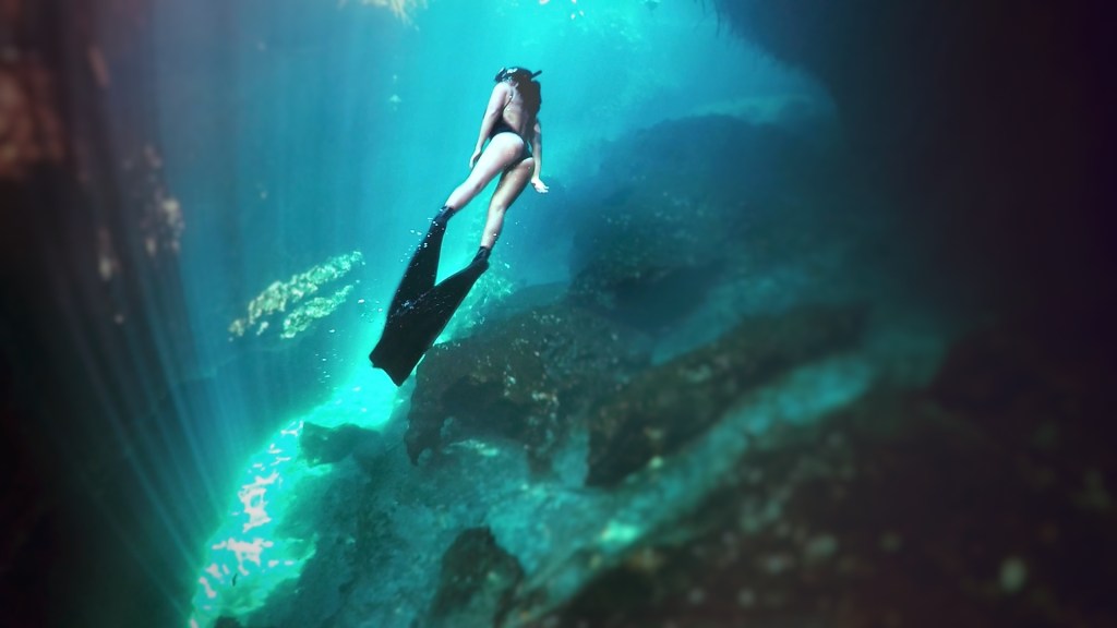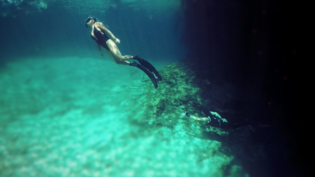Photo: Elvis James looking upward as a student descends into the beautiful cenote angelitaTalented freediver Tiffany enjoying the clear cenote waters of mexicoFreedive Tulum instructor playing around in the cloud 30 metres down in cenote angelita mexico. this cenote is famous for having the thickest cloud of all the cenotes