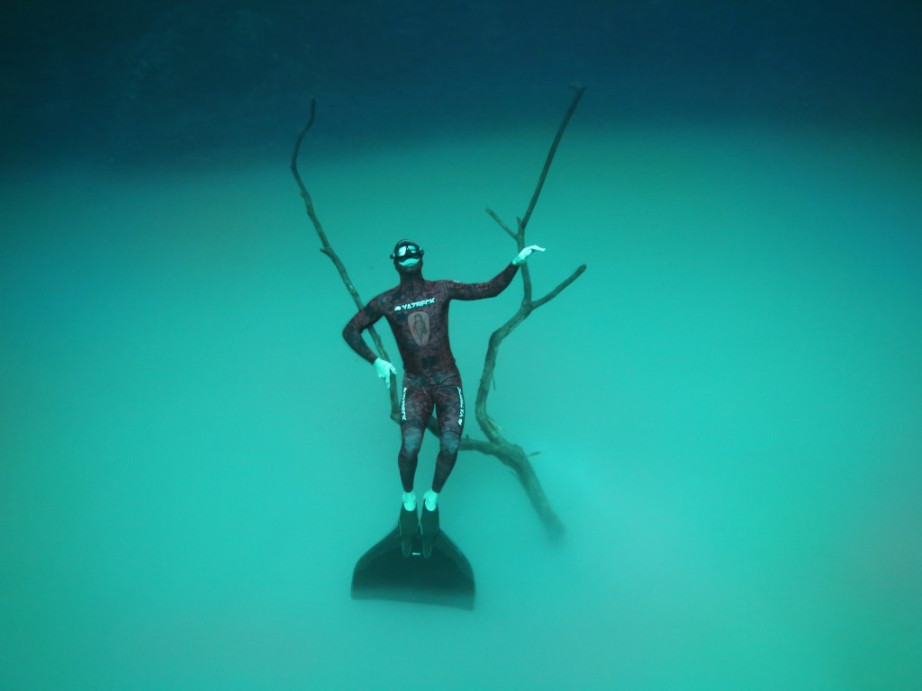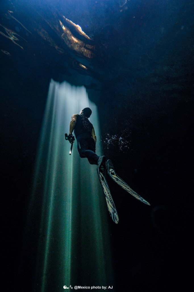 Photo: AJ Li Cenotes come in all shapes and stylesFreedive Tulum instructor chilling in the Pitworld champion freediver Alexey Molchanov capturing bullsharks in Playa del Carmen, Mexico